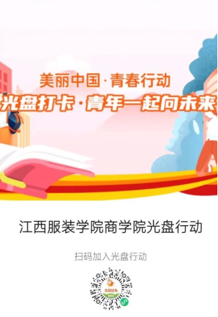 为倡导同学们节约粮食,提倡“光盘行动”。现准备再次进行光盘接力挑战,具体参加方式在微信关注“美丽中国青春行动”公众号。在专项行动一栏寻找光盘打卡参与,进入后搜索组织“江西服装学院太阳集团tyc5997”加入组织或微信扫码后加入组织,进入后将名称改为“姓名加学号”,否则将影响后期学分置换,并且在组织内打卡才算有效,活动时间为6月1日至6月24日,在活动时间内每天至少一次打卡且打卡满21天即可置换第二课堂0.4学分,20级置换学分为志愿服务类,21、22级置换学分为劳动实践类。请各年级参加同学加入对应群聊,活动后续内容将在群内通知(注:请参加活动同学务必按照要求进入组织并且更改姓名)注:群聊二维码在文章末