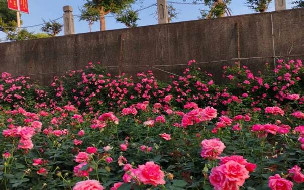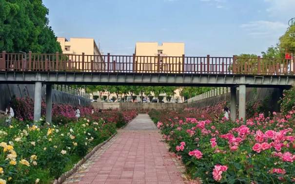 在校园的花园小径旁,一片由玫瑰、月季、蔷薇组成的花海,成了校园里当之无愧的颜值“显眼包”!