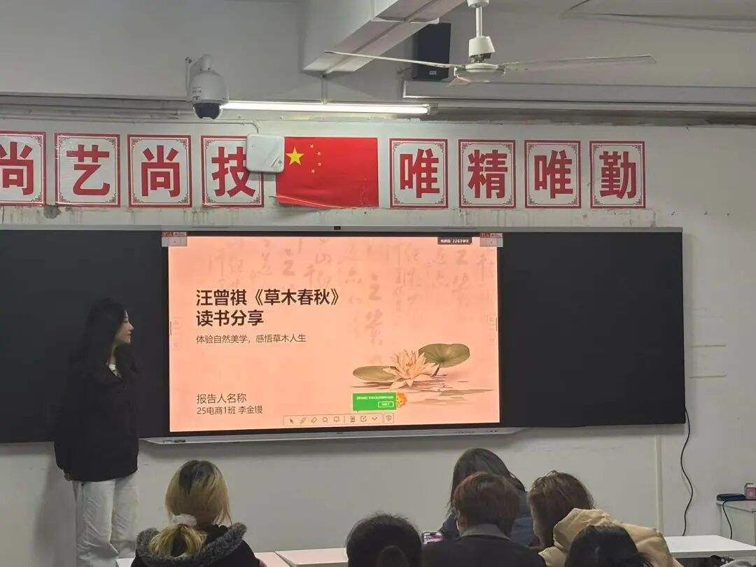 四位分享者结合精心准备的ppt依次发言,带来了精彩纷呈的书籍解读。24物管1班的戴家慧带领大家走进《我与地坛》,探寻生命在自然中沉淀的力量,让在场者领悟到“生命的意义在于对每个瞬间的深情注视”;25市营1班的刘泰鸿分享《花园生活美学》,传递慢时光里感知生命美好的生活态度;25电商1班的李金镘解读《草木春秋》,带大家在文字中寻回浮躁世界里的从容;24市营本科1班的邱瑜乐分享《人间草木》,让草木的清新与生活的暖意浸润人心。