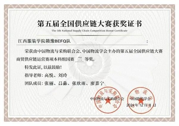2024年获得第五届全国供应链大赛国赛三等奖。