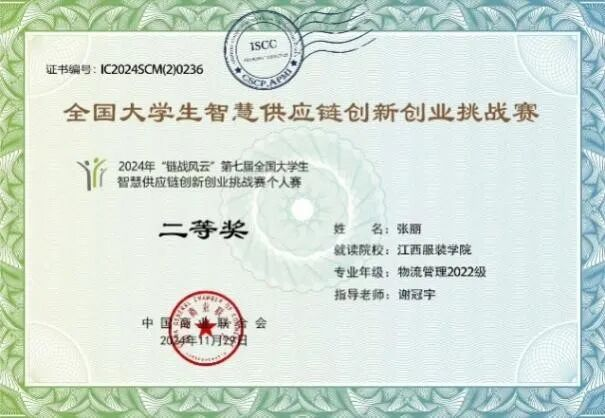 2024年获得全国大学生智慧供应链创新创业挑战赛二等奖。