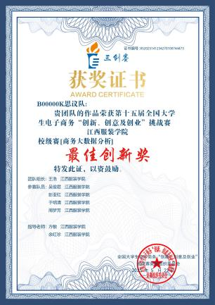 2025年5月获得第十五届全国大学生电子商务“创新、创意及创业”挑战赛校级赛商务大数据分析赛道“最佳创新奖”;
