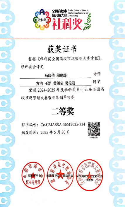 2025年5月获得社科奖第十六届全国高校市场营销大赛营销策划单项赛二等奖;